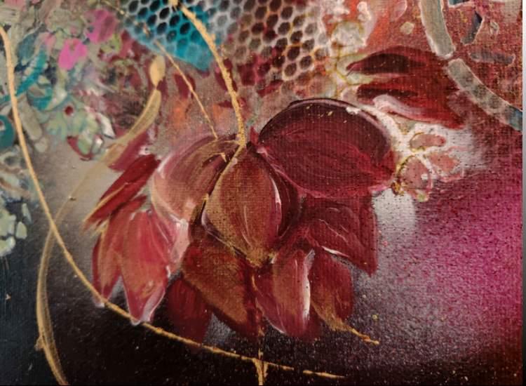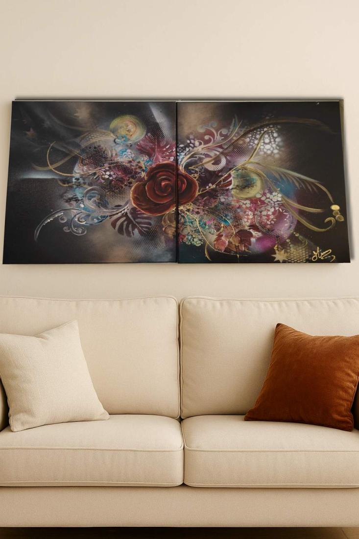 Ce tableau floral abstrait offre une explosion visuelle entre énergie cosmique et beauté organique. La rose centrale, entourée de volutes, de pétales stylisés et de touches dorées, attire le regard et insuffle une ambiance à la fois romantique, dynamique et artistique.