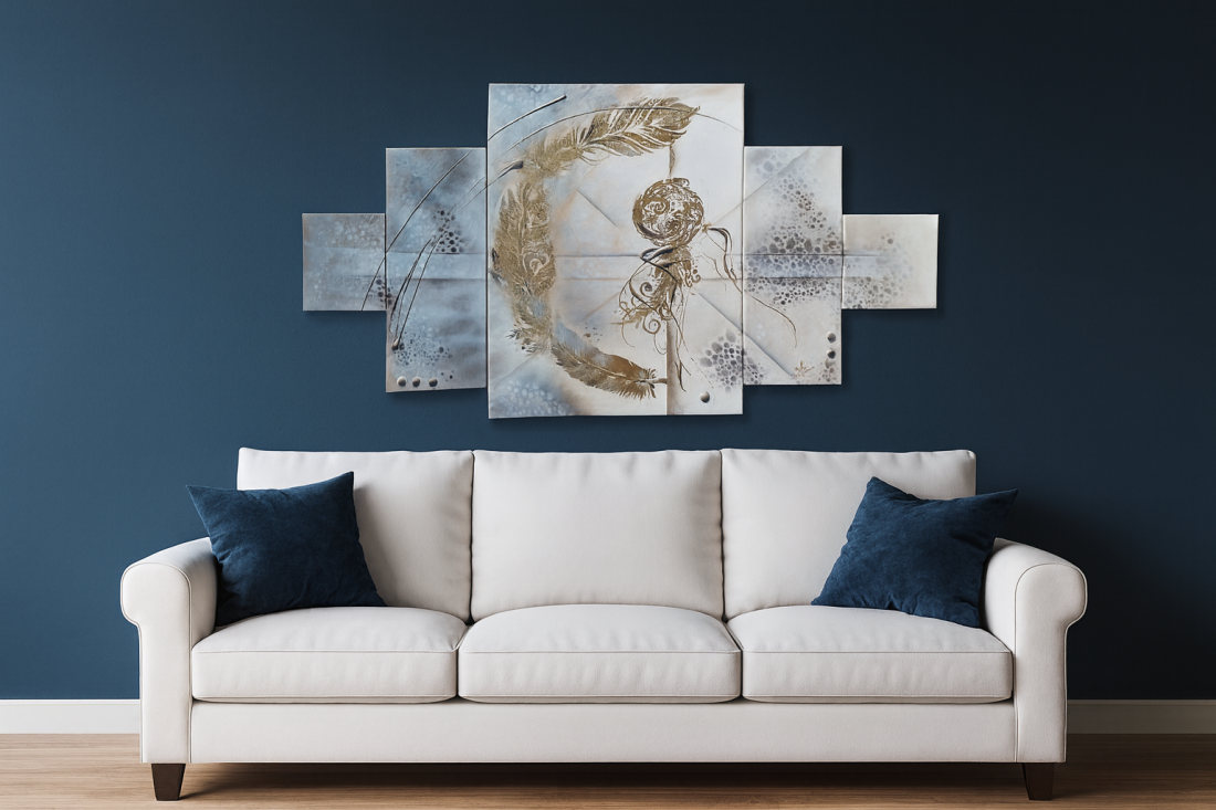 Tableau abstrait moderne multi-panneaux, tons doux et dorés, motif plume et arabesques. Idéal salon ou chambre. Œuvre unique, livraison rapide.