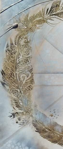 Découvrez une œuvre contemporaine élégante et apaisante, composée de plusieurs panneaux formant une composition harmonieuse. Ce tableau met en valeur une plume dorée finement travaillée, accompagnée de motifs délicats et texturés, dans des tonalités douces de gris, blanc et or.