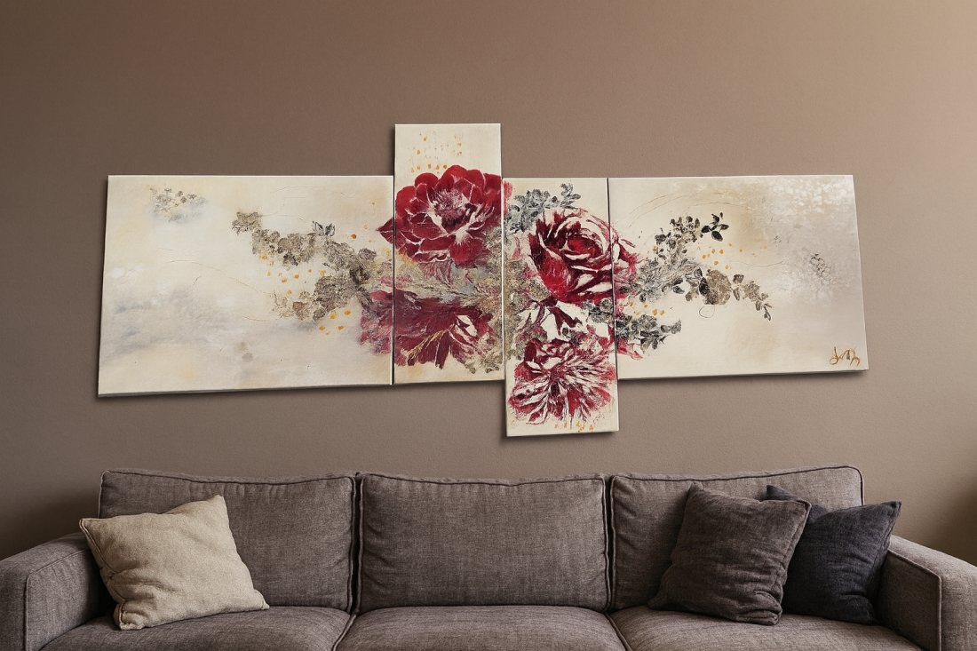 Ce tableau moderne en 4 toiles offre une composition artistique pleine de douceur et d'intensite.
